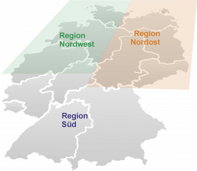 REGION NORDOST: - Mecklenburg-Vorpommern, Brandenburg, Sachsen, Sachsen-Anhalt, Thüringen REGION NORDWEST: - Schleswig-Holstein, Niedersachsen, Nordrhein-Westfalen REGION SÜD: - Baden-Württemberg, Bayern, Hessen, Rheinland-Pfalz, Saarland + Österreich |